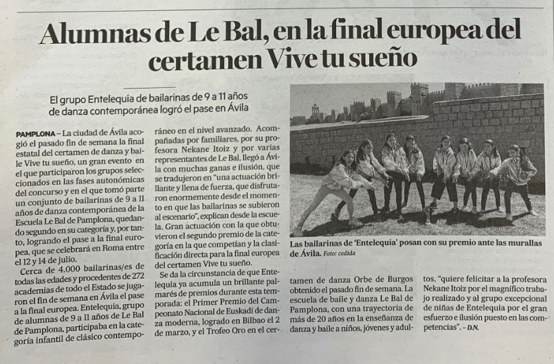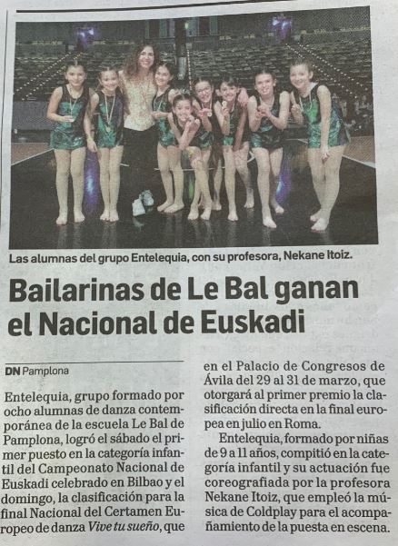 Y junto a ellas, también viajará su profesora de Le Bal y autora de la coreografía de la competición, Nekane Itoiz: “Cuando empezó la temporada mi objetivo era que consiguieran algún premio, pero lo que han logrado este grupo excepcional de niñas, ha superado todas mis expectativas” .