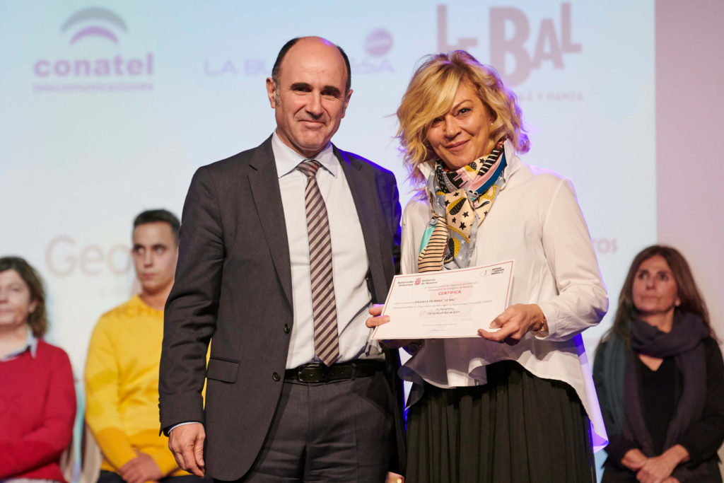Paqui Fernández, como gerente de La Escuela de baile y danza Le Bal, recibió hace unas semanas y de manos del consejero de Desarrollo Económico y Empresarial, Manu Ayerdi, el diploma acreditativo de que Le Bal ha desarrollado el diagnóstico de Responsabilidad Social Empresarial según la metodología innovaRSE del Gobierno de Navarra.