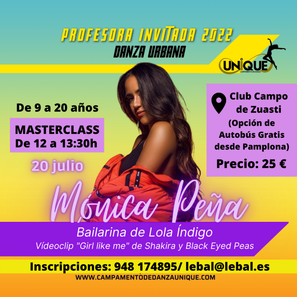 Además, no te puedes perder la masterclass de una de las bailarinas de Lola Índigo, Mónica Peña, en nuestro campamento de baile y danza Unique en Zuasti para chicos y chicas de 9 a 20 años.